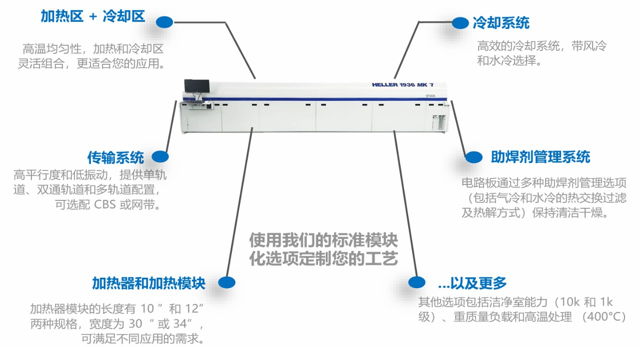新的MK平台通过几种新的突破性设计彻底改变了回流焊行业。 薄型模块提供更低的ΔT,同时降低整体能耗。新的助焊剂管理选项可提供好的功能并缩短整体PM时间。 新的冷却系统提供出色的冷却速率和较低的出口温度,同时在温区之间提供出色的热隔离能力。