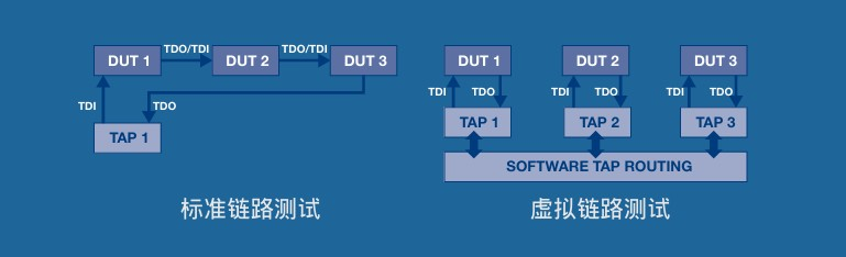 边界扫描虚拟链路测试:使用 TRI BSCAN2 模组里的简洁化软体 TAP 来测试链结 DUT,减少治具布线和测试程序的复杂度。